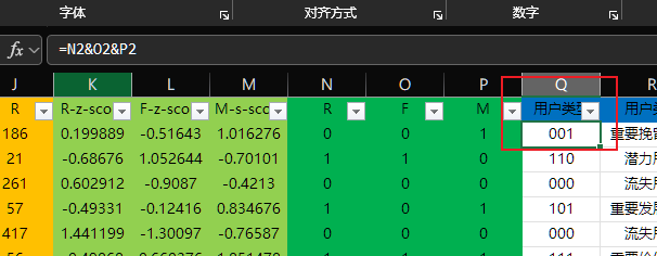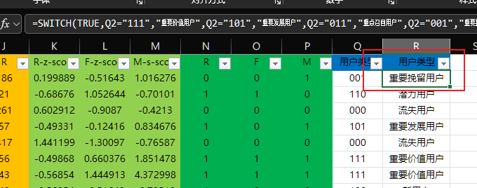=SWITCH(TRUE,Q2="111","重要价值用户",Q2="101","重要发展用户",Q2="011","重点召回用户",Q2="001","重要挽留用户",Q2="110","潜力用户",Q2="100","新用户",Q2="010","一般维持用户",Q2="000","流失用户")