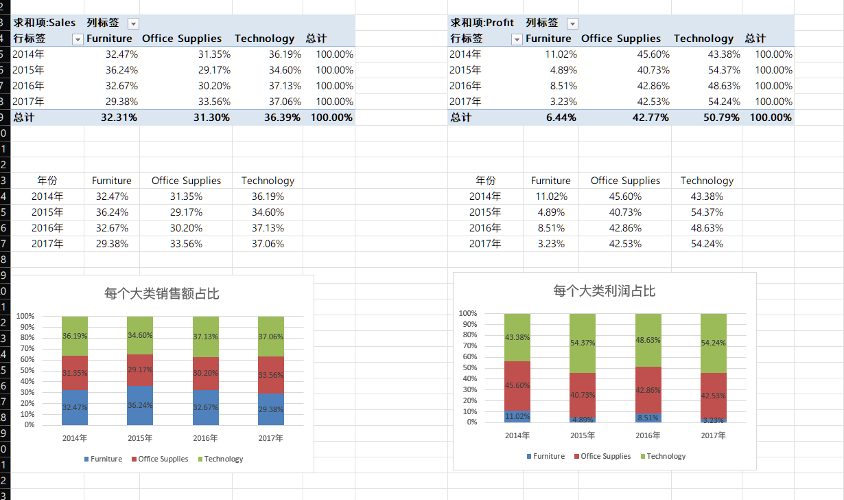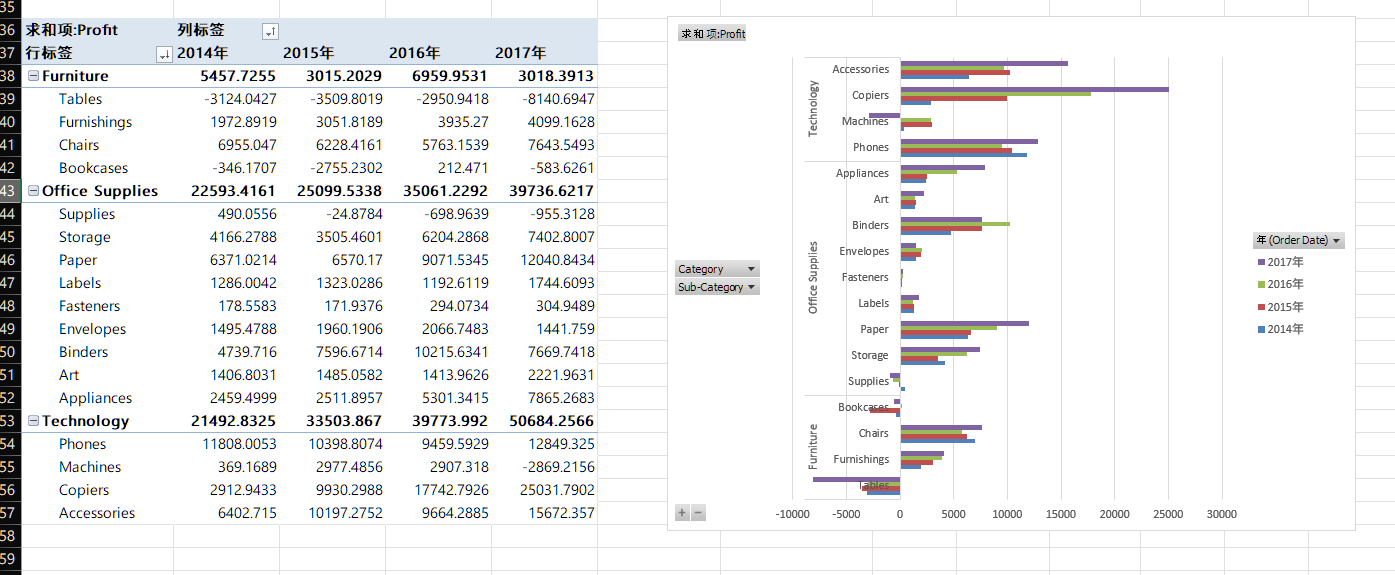 Furniture 类目每年平均销售占比达32.5%,但是利润平均占比却只占有6.5%,且呈现逐年下降的趋势;说明 Furniture 类目并非商城核心利润类目;我们需要进一步判断Furniture 类目的情况。