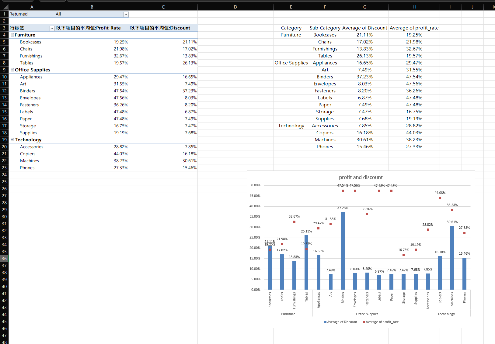 Average of discount 是每个品类目前实际的折扣率,可以看到目前实际折扣率大于利润空间的有 tables and bookcases ,那这两个品类必然会亏损;