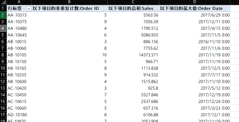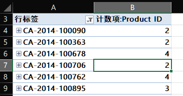 同样对Product Details表进行数据查看,利用透视表,发现有Order ID和Product ID重复出现的情况,经查看,将这样的数据认为是一个客户在同一个购物车中添加了多件商品,故不当成异常值处理,所以也就不对Product Details表进行去重处理。