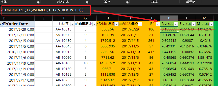 将透视表结果单独复制,然后利用excel 公式得出R(最后一次购买时间距今天数),因为数据是2017年的,所以为了真实模拟分析,所以将计算日期也就是今天设定为2018-1-1。然后利用标准化公式计算RFM每一个字段的标准化分数,以J列R的值为例,其他以此类推=STANDARDIZE(J2,AVERAGE(J:J),STDEV.P(J:J)) 。