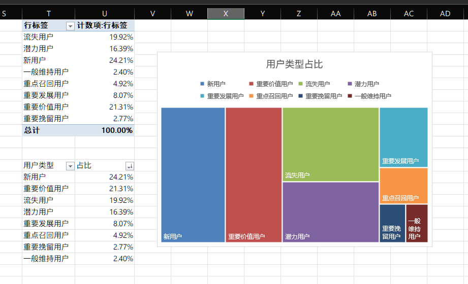 最后根据数据制作树状图,以便清晰的看出不同类型的客户的占比情况。