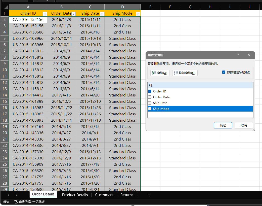 首先对order details表进行去重,由于row_id(行号)对于分析没有意义,遂将其删除。利用数据选项卡-删除重复值数据,对数据进行操作,得到5009行订单记录。