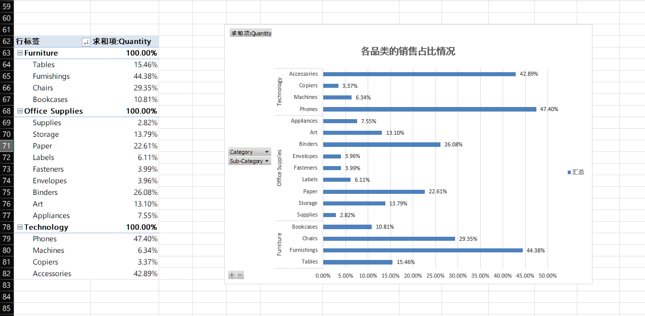 从该图发现 tables+bookcases在Furniture中占比仅为26%,Supplies在Office Supplies中占比仅为3%;Machines在Technology内占比为6%;确认调整意见判断应该停止tables、bookcases、supplies的进货,在处理完库存后,关闭该销售品类。