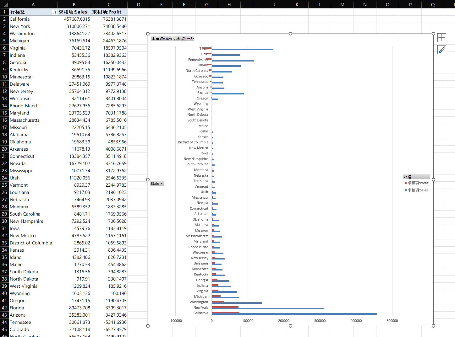 在去除上一节提到的三个之类后,通过查看查看有几个州销售额度不错,但是却出现大量亏损的情况。地区无法像品类一样,可以简单的停止销售。