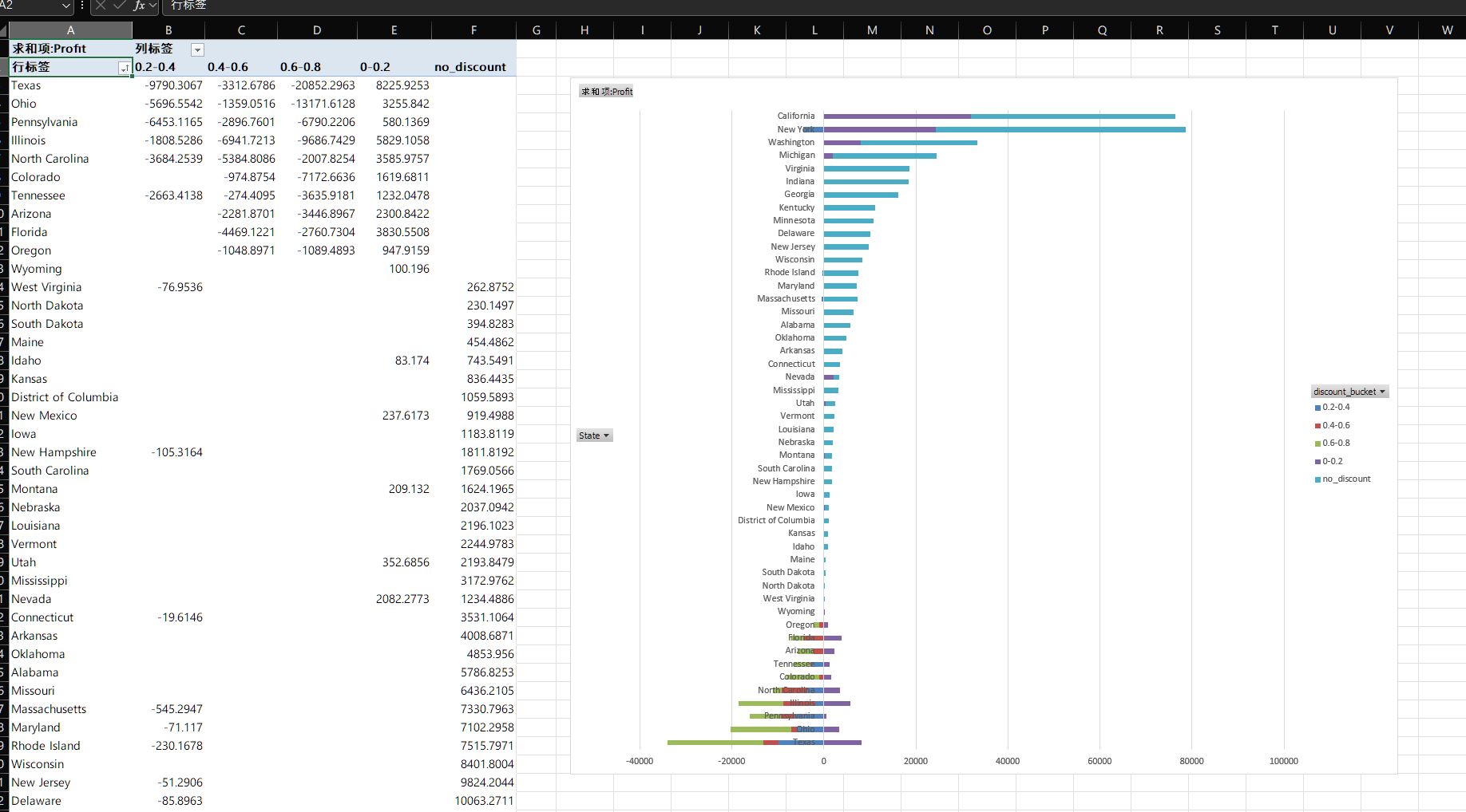 由上图可以看到,利润为负的州折扣非常集中,且折扣价格都超过了20%;